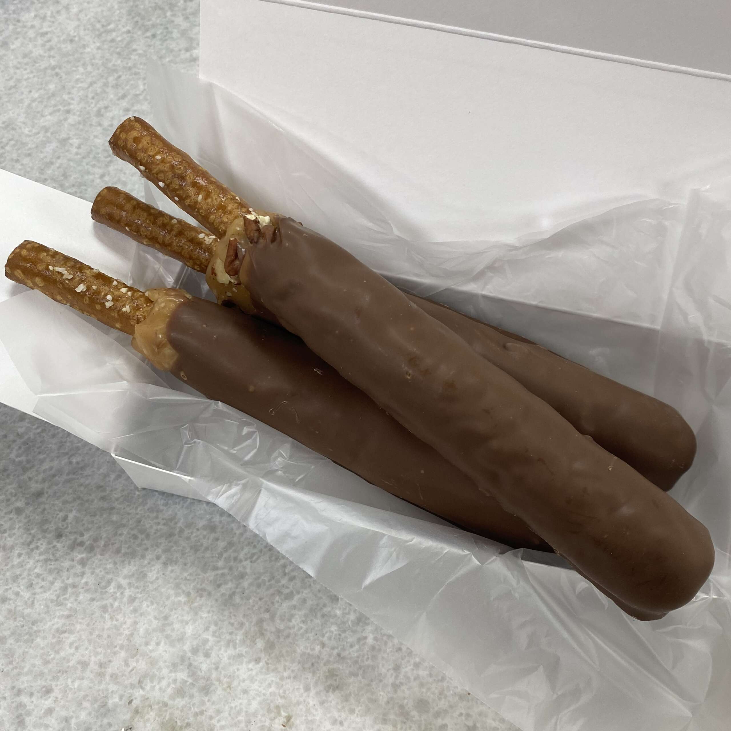 Ordered by the package (3pc). A pretzel rod, dipped in caramel, rolled in pecans then dipped in chocolate.